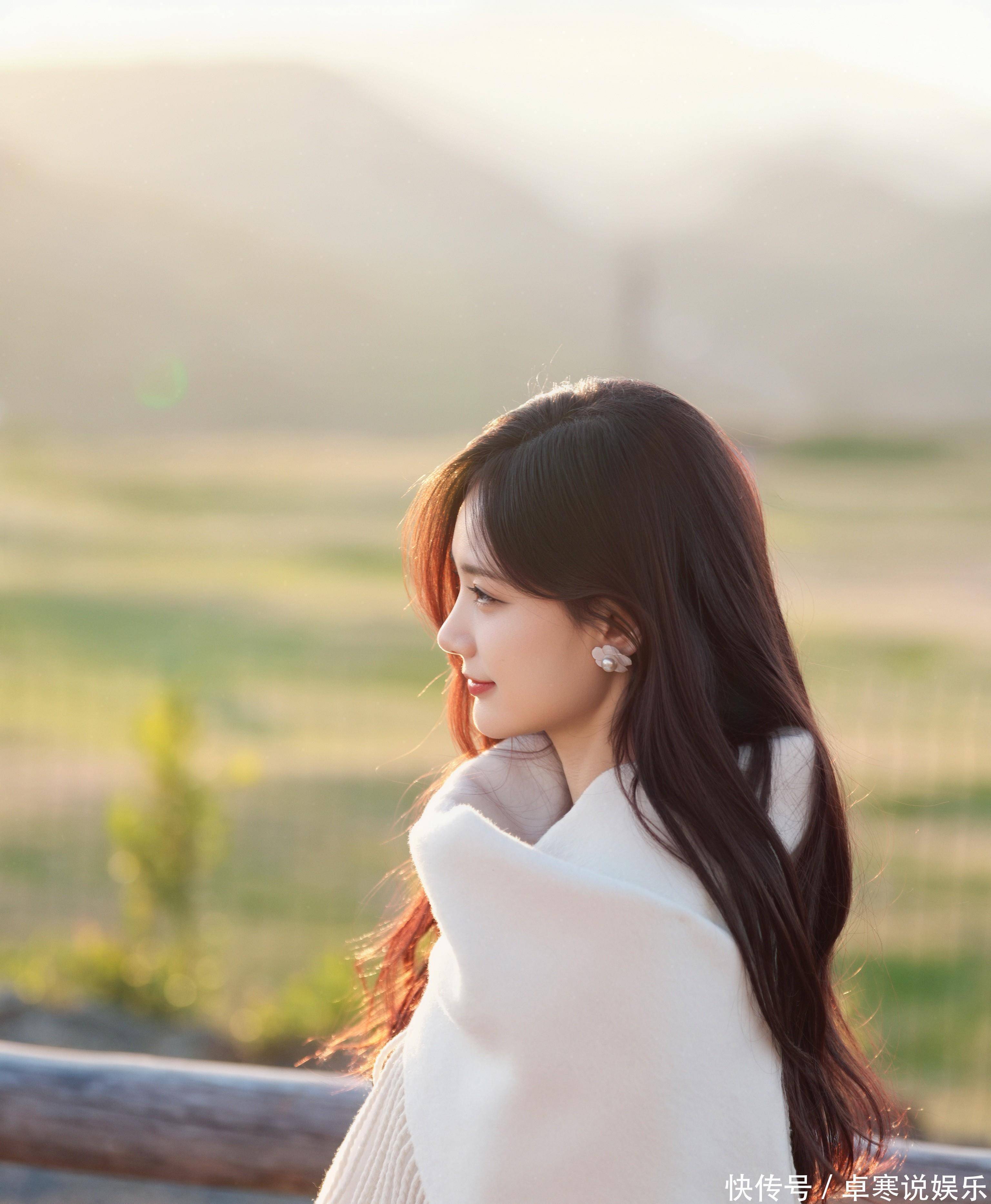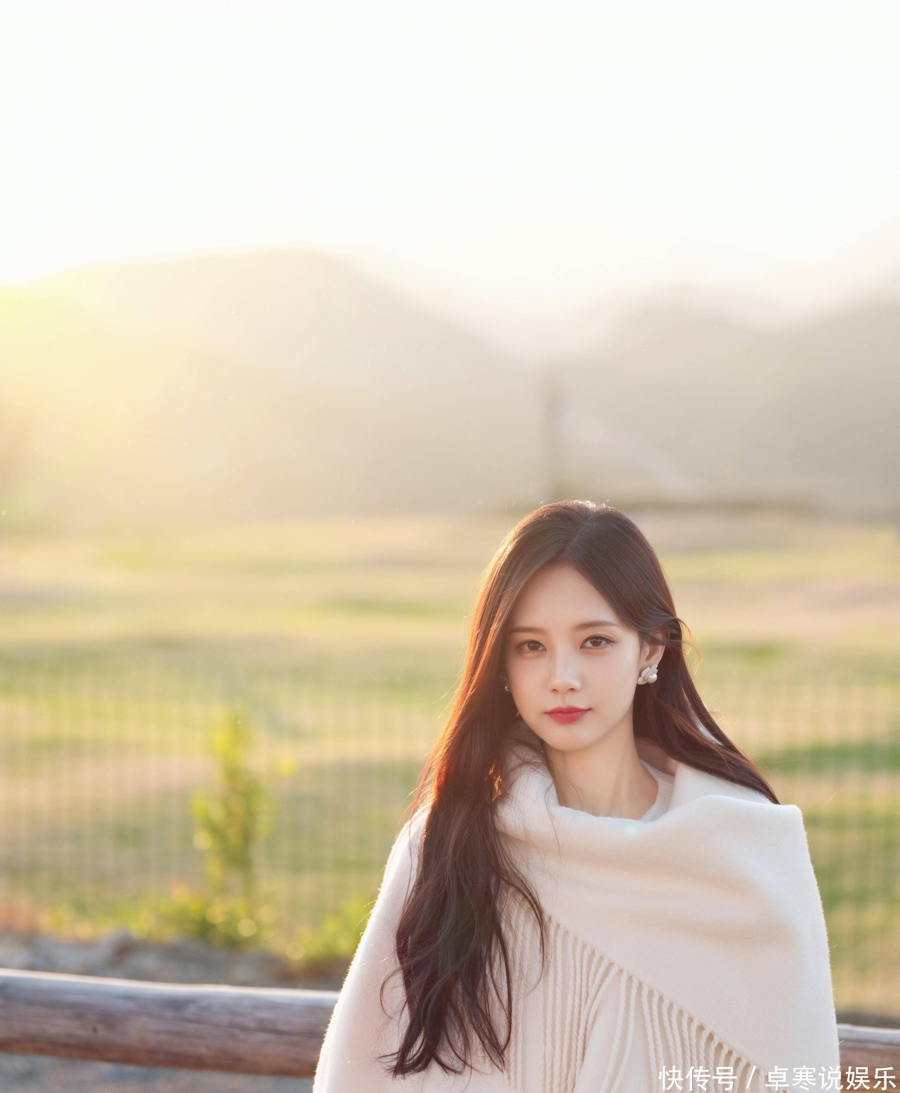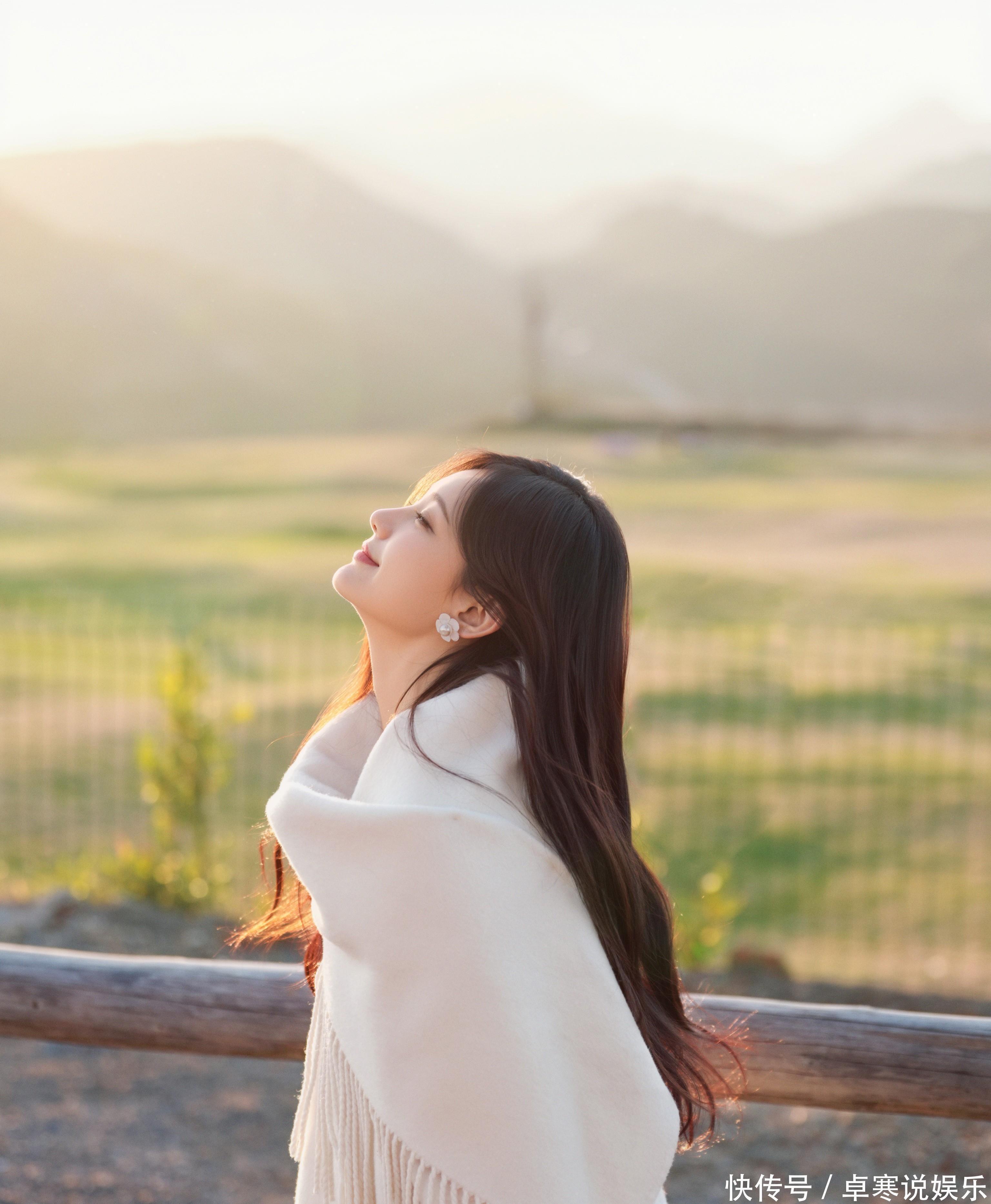 可一到户外,画风就变了。那件米白色的羊绒流苏披肩一搭上,整个氛围就不一样了。羊绒软乎乎的,自带暖感,风一吹,流苏跟着晃,走路带风不说,还拉长了身形比例。你看她在自然光底下走,披肩随着步伐轻轻摆动,背景是绿植或空旷场景,那种柔柔的、带着点故事感的情绪一下子就出来了。这不是单纯为了保暖,是懂氛围的人才玩得转的小动作。